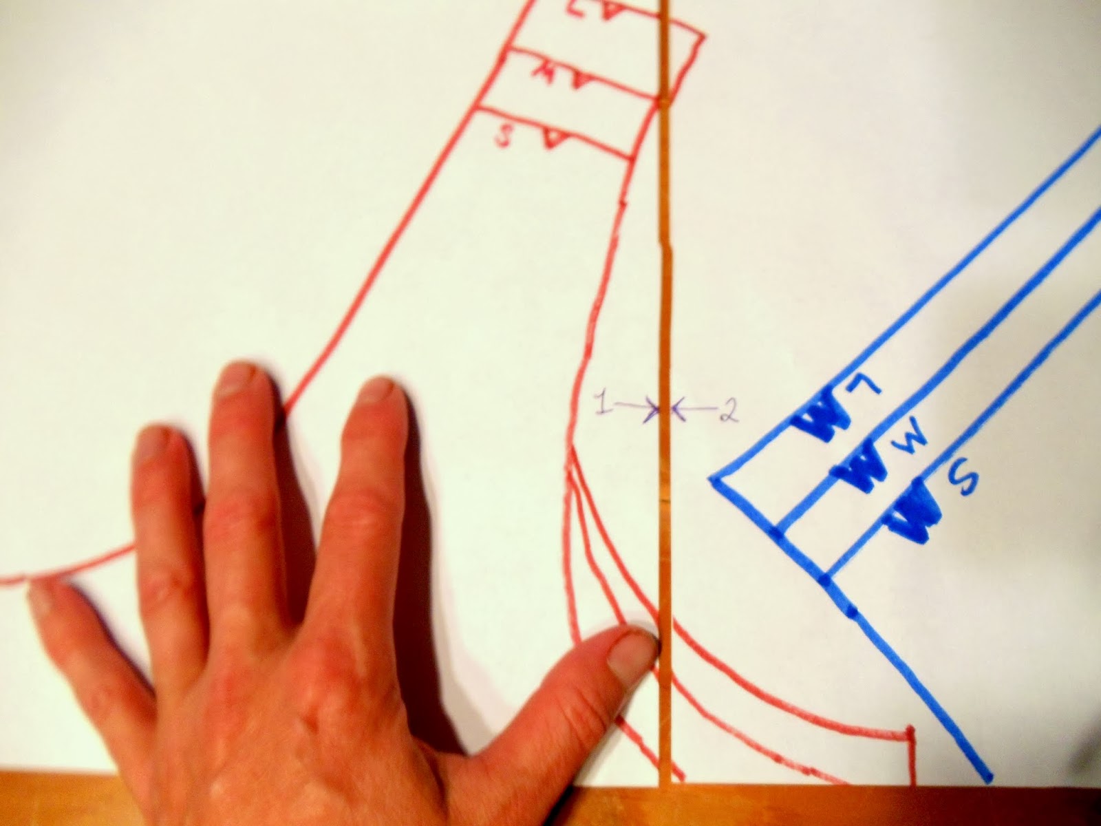 For the UPPER FRONT, take page 3 of your pattern pieces and underline where it says "upper front cut 2", just right under the words "cut 2"; then draw little arrows on either end of your underline. There. See what I did there? ---->